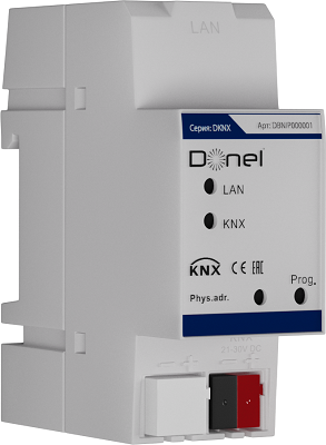 Donel DBNIP000001 В зависимости от выбора устройств управления Donel/KNX, вы можете управлять не только освещением или жалюзи, но и системами климатического контроля и развлекательными мультимедийными решениями. А с появлением новых устройств и решений, при необходимости, вы всегда можете дополнить систему. KNX IP – интерфейс • Служит интерфейсом связи между установками KNX и IP-сетями. • Для настройки, параметризации и ввода в эксплуатацию установки KNX, а также группового мониторинга через локальную сеть с помощью программного обеспечения ETS (ETS5 или более поздней версии) . • IP-адрес устройства может быть фиксированным или получено автоматически черезDHCP . • Поддержка телеграммы UDP/TCP и номера порта 3671 • Поддержка обновления устройства через сеть. • Поддержка протокола KNX Secure (KNXnet/IP Security). • Поддержка 5 клиентов. • Заводской физический адрес по умолчанию: 15.15.254 • Заводской IP-адрес по умолчанию: 192.168.2.200, маска подсети: 255.255.255.0, шлюз по умолчанию: 192.168.2.1