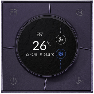 HDL MPHY-4B-BP.18 Материал - металл. Поворотная клавиша Knob. Подсветка клавиш, гравировка иконок. Датчик температуры, влажности и приближения. Работает с шинным соединителем MPFPIT-1P-BP.18 Цвет: Сливово-фиолетовый" Термостат серии Inkslab — стильное и функциональное устройство для управления климатом в современном «умном доме». Изготовленный из алюминиевого сплава.