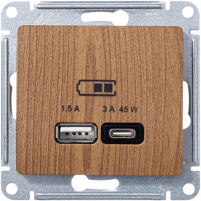 GSL000529 GLOSSA USB РОЗЕТКА А + тип-С 45Вт высокоскор.заряд. QC, PD, механизм, ДЕРЕВО ДУБ 6273 шт.