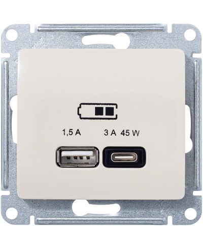 GSL000929 GLOSSA USB РОЗЕТКА А + тип-С 45Вт высокоскор.заряд. QC, PD, механизм, МОЛОЧНЫЙ 4810 шт.