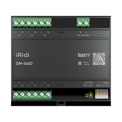 iRidium DM-060D Модуль позволяет организовать диммируемое управление группами освещения - Поддерживаются светодиодные диммируемые лампы, диммируемые токовые балласты, галогеновые лампы, лампы накаливания - Поддержка сценариев