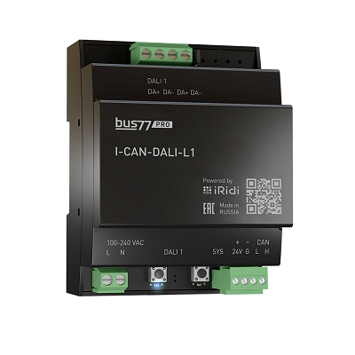 iRidium I-CAN-DALI-L1 Устройство предназначено для установки в проектах автоматизации квартир, домов, зданий в децентрализованной сети Bus77 iRidi©. Устройство обеспечивает передачу сигнала между сегментом системы управления освещением DALI (Digital Addressable Interface, совместимость со стандартами: IEC 62386-101, IEC 62386-102) и управляющими устройствами Bus77 (датчиками, кнопками): - встроенный блок питания шины DALI; - набортная кнопка для проверки подключения устройств DALI после монтажа (броадкаст); - подключение и настройка до 64 осветительных устройств DALI (драйверы, балласты), включая устройства DT8 (Tunable White, RGB, RGBW); - поддержка 16 групп; - поддержка 127 сценариев Bus77; - адресное и групповое управление с устройств Bus77; - статусы о неисправности устройства DALI, неисправности лампы, восстановления питания шины;