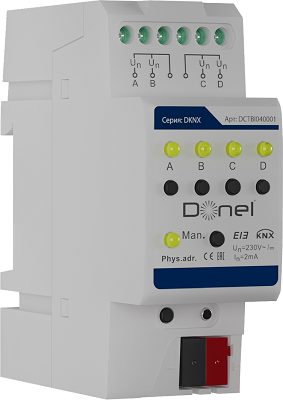Donel DCTBI040001 В зависимости от выбора устройств управления Donel/KNX, вы можете управлять не только освещением или жалюзи, но и системами климатического контроля и развлекательными мультимедийными решениями. А с появлением новых устройств и решений, при необходимости, вы всегда можете дополнить систему. Бинарный вход 4-канальный • Функции переключения и затемнения • Функции управления жалюзи и рольставнями • Функция отправки значения/принудительного вывода • Функция управления сценами • Функция многоуровневого управления • Функция последовательности переключения • Функция стандартного и дифференциального счета • Функция отключения/включения канала