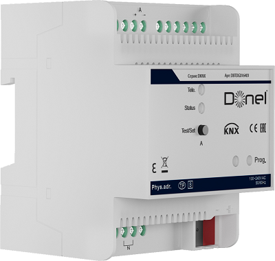 Donel DBTDG016401 В зависимости от выбора устройств управления Donel/KNX, вы можете управлять не только освещением или жалюзи, но и системами климатического контроля и развлекательными мультимедийными решениями. А с появлением новых устройств и решений, при необходимости, вы всегда можете дополнить систему. Шлюз DALI/KNX • Один выходной канал, 64 устройства DALI. • Переключение, диммирование и установка значения яркости для каждого устройства DALI. • Управление сценами: до 16 различных сцен для каждого канала. А значения яркости сцен настраиваются с помощью инструмента конфигурации (программное обеспечение DCA или ПК). • Групповое управление: до 16 различных групп для каждого канала. Назначьте устройства DALI группам с помощью ETS или инструмента конфигурации. И переключение, затемнение и установка значения яркости для каждой группы. • 8 шаблонов поведения для группы и настройки действий ЭКГ, а также конфигурация ЭКГ, которую можно изменить с помощью инструмента настройки. • Отправка или ответ на различные состояния, например. выключатель, яркость, часы работы и т. д. • Обнаружение неисправностей ламп и балластов для устройств DALI. • Мониторинг напряжения на шине DALI, тока на шине DALI и состояния короткого замыкания на шине DALI канал.